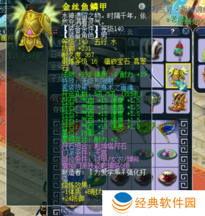 140级无级别男衣,16锻翡翠石,熔炼后防御+255,体质-3,耐力+27。