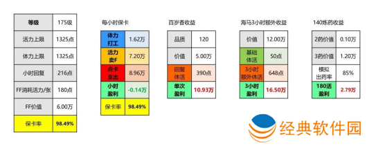 单开175级玩家总结体力、活力的各种收益,包含卖符和140级炼药。用百岁香和海**额外收益。讲述了每小时如何保点卡,仅供参考,希望对大家有帮助。