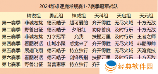 下面是小美为大家整理的今年群雄逐鹿七个赛季六大组别的冠军战队,少侠们可以用来作为竞猜参考哦: