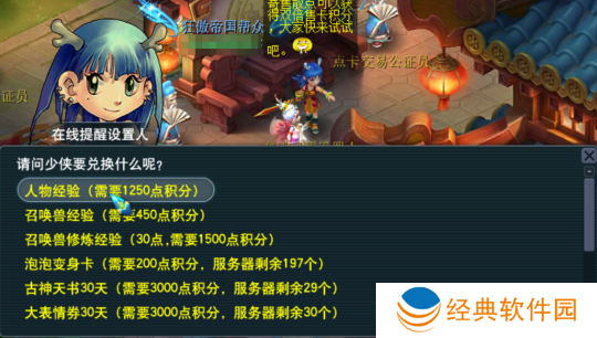 另外,使用过“售卡服务”的少侠,也不要忘记去秦府后院兑换自己的售卡积分。不但可以换取大量人物/宝宝经验,还可以换取泡泡变身卡、古神天书、大表情券等奖品哦。