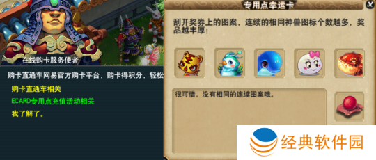 大家只要前往长安城(205,126)处点击“在线购卡服务使者”,选择“ECARD专用点充值活动相关”,即可领取包括大量经验在内的奖励,运气好的少侠还能获得特赦令牌、高级魔兽要诀哦。