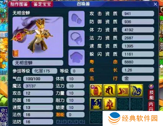 这就是本次新资料片所带来的新的召唤兽,无相金蝉目前只在部分服务器内上线,不过已经有人弄出来了双特殊的金蝉子了,上面的这只召唤兽拥有着欣欣向荣和净台妙谛,而且连高级金蝉脱壳都已经被保留下来了,甚至被赐福出来了超级技能,只是野生有点美中不足了。
