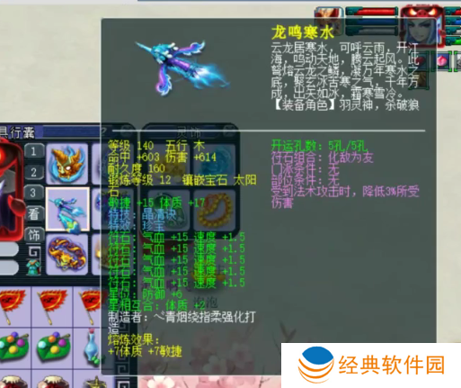 140级晶清诀武器,12锻太阳石,伤害+614,熔炼后体质+24,敏捷+22。