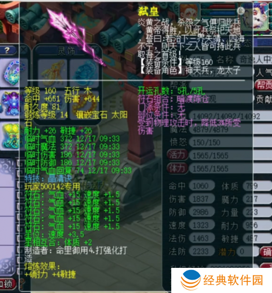 160级晶清诀武器,14锻太阳石,伤害+644,熔炼后耐力+30,敏捷+30。