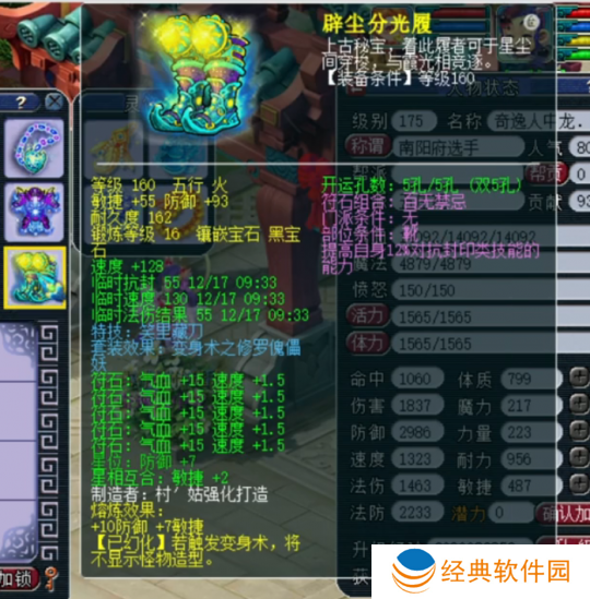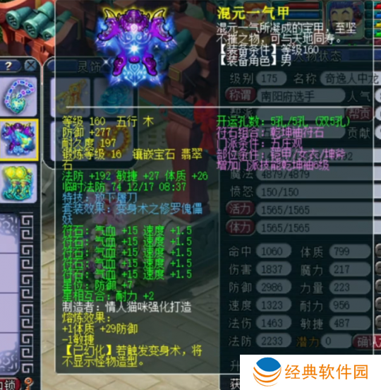 160级放下屠刀男衣,16锻翡翠石,熔炼后防御+306,体质+27,敏捷+26。