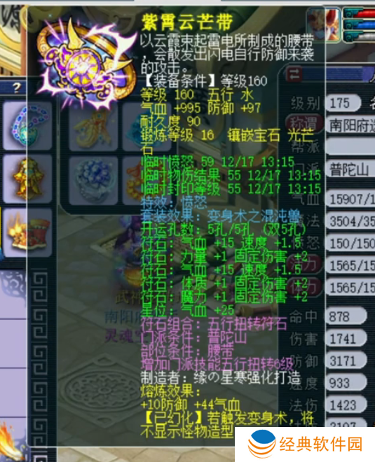 160级愤怒腰带,16锻光芒石,熔炼后防御+107,气血+1039。