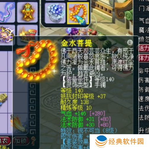 140级手镯,主属性抗封,下排2法防1气血,带8级锐不可当。