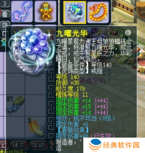 140级戒指,主属性防御,下排3固伤,带8级锐不可当。