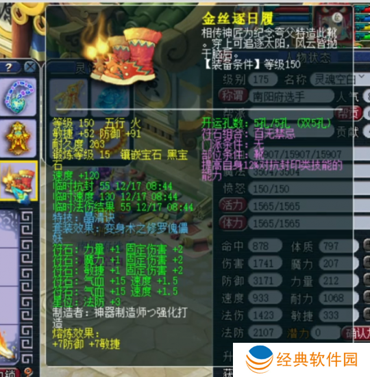 150级晶清诀鞋子,15锻黑宝石,熔炼后防御+98,敏捷+59。