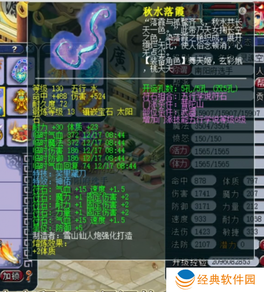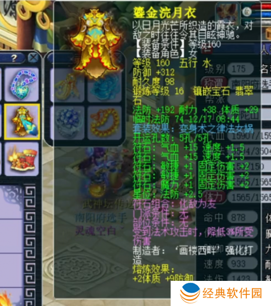 160级高属性女衣,16锻翡翠石,熔炼后防御+321,体质+31,耐力+38。