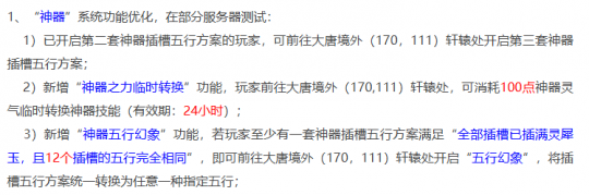 简单来说,本次优化给神器增加了三个新功能。一是将之前的两套神器方案变成了三套;二是可以消耗100点神器灵气转换身为技能(有效期24小时);三是达成“大四喜”条件后,可以找轩辕开启“五行幻象”,将插槽方案转换为任意一种指定五行。