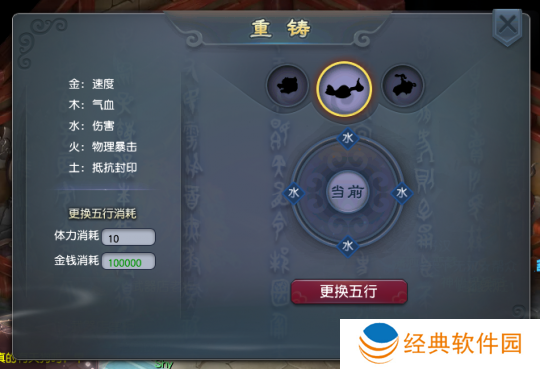 如果你之前洗了“大四喜”,就可以靠着新功能获得一套“大四喜”。要知道,神器五行同人物属性有关。以凌波城为例,水属性对应的是伤害,火属性对应的暴击,如果你之前洗过12水,就可以无压力换成12火提升暴击,或者换成12金提升速度。