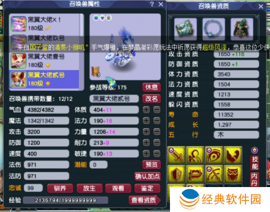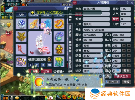 改装备套装后,满符气血10785,伤害3882,防御2130,法防1568。