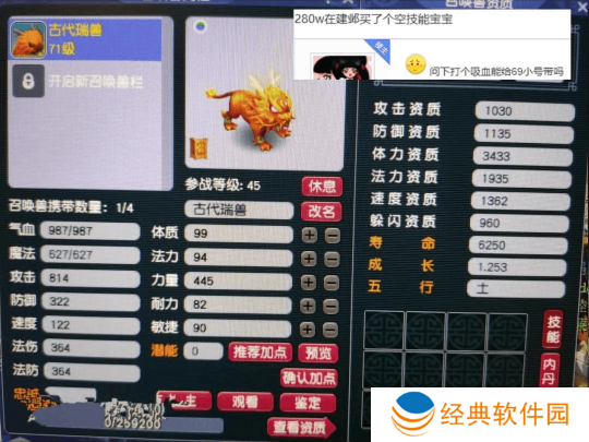 很难想象现在梦幻还有这样刚入门的小白,花280w梦幻币买了一只白板瑞兽,准备打一本吸血给小号用。咱就是说,这样瑞兽既不是变异,攻资也差,就算领悟了也和攻宠关系不大,以后消费前还是多问问吧。