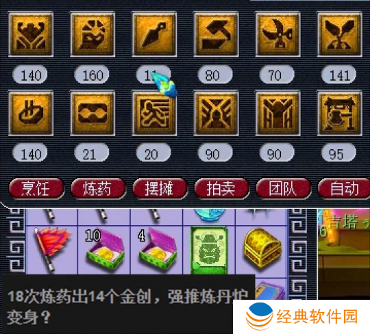 这位玩家的中药医理的技能等级已经达到了141级,但自己炼药18次就出现了14个金创药。不知道用新版变身的炼丹炉,出三药的次数会变多吗?炼药时只使用3个二药也会提高金创药的出现几率噢。