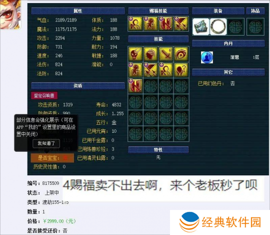 这位玩家的召唤兽虽然有着9红的技能,以及4个完美赐福。但是就因为他是只野生召唤兽,所以一直卖不出去。野生召唤兽天生就比宝宝要少50点属性,这对于pk宝宝来说更是致命打击,如果这只召唤兽不是宝宝,那价格至少还要在翻一倍。