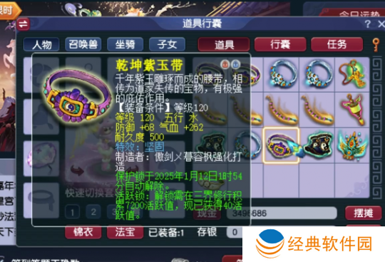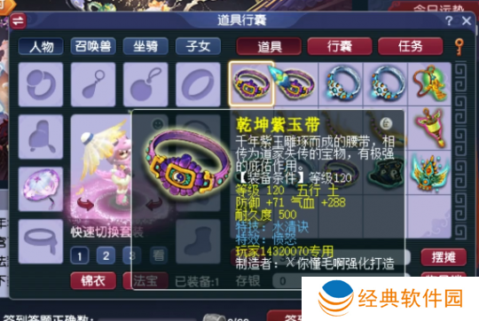 首先,是一条120级的愤怒水清诀腰带,它不仅是稀有装备,而且水清诀作为PK常用特技,更是价值连城。然而,这条腰带却带有专用,无法自由交易,这无疑是一个小小的遗憾。