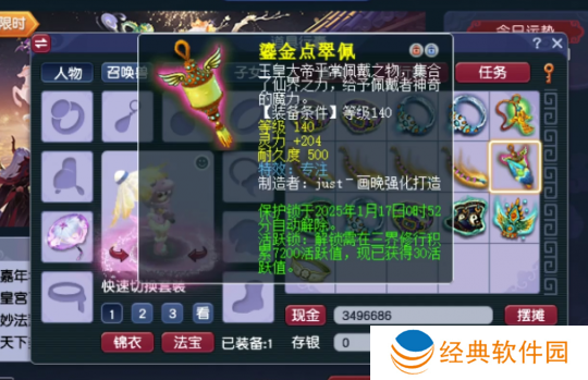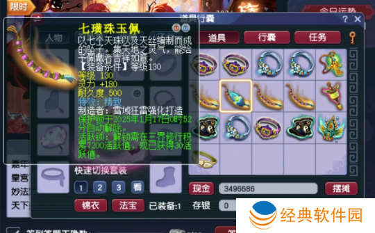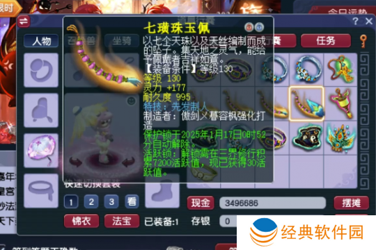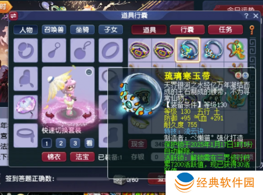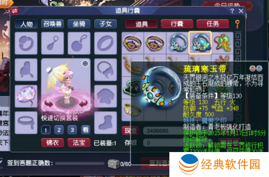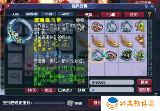 130级不磨腰带,防御+77,气血+283,附加变身术狼,可惜套装不对,如果能出一个物理套装也能卖不少钱。