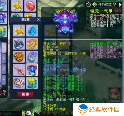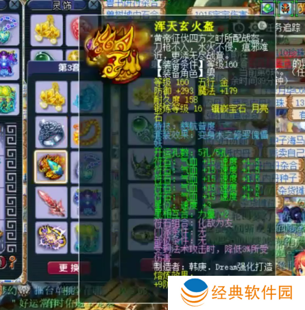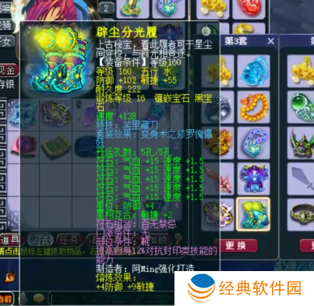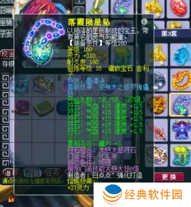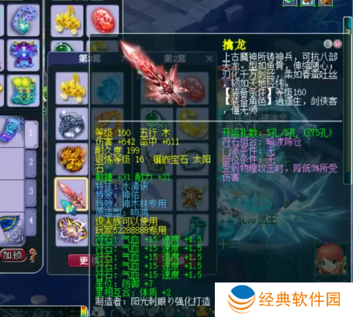 160级神佑水清诀武器,16锻太阳石,伤害+642,敏捷+31,耐力+31。