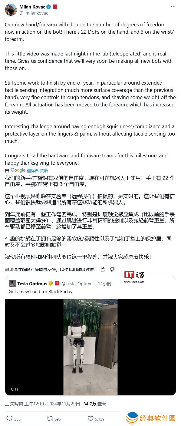 Optimus 工程师米兰・科瓦奇(Milan Kovac)随后发布了演示的详细说明,表示第二代 Optimus 机器人在手腕精细程度上更加灵活,手部有 22 个自由度(DoF),腕部有 3 个,能够模仿人类肌腱结构,更自然流畅地完成更复杂的任务。