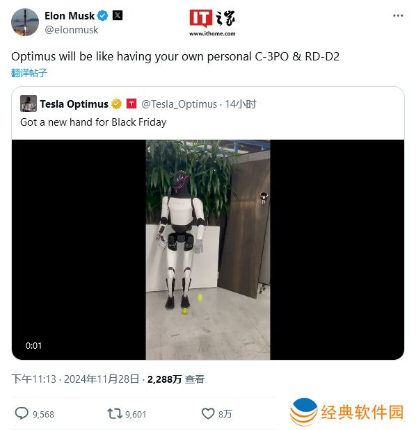 特斯拉首席执行官埃隆・马斯克随后转发该视频,并祝贺说:“Optimus 将打造成你的专属私人 C-3PO 和 RD-D2”。