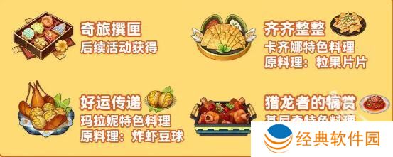 14、奇旅撰匣,后续活动获取。齐齐整整是卡齐娜特色料理,好运传递是玛拉妮特色料理,猎龙者的犒赏是基尼奇特色料理。