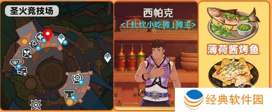 2、纳塔圣火竞技场小吃摊摊主西帕克可以购买:薄荷酱烤鱼、粒果片片。