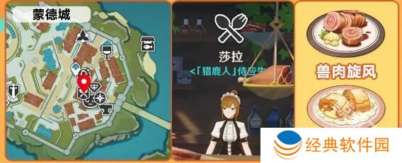 1、蒙德城找到猎鹿人萨拉可以购买:兽肉旋风、苹果卷。