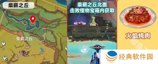 12、柴薪之丘北面,击败怪物宝箱之后,可以获得火焰炖肉。