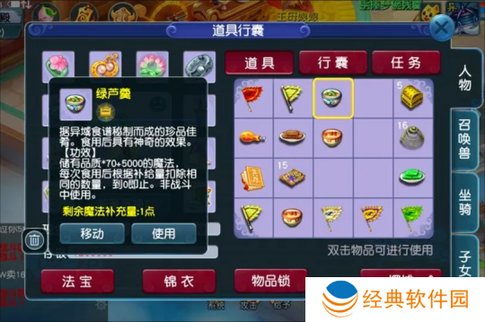 不得不佩服这位玩家,他把系统送的绿芦羹只用到了剩1点。也许有很多玩家不知道,这样的绿芦羹有什么作用。实际上在进行天下识君等日常任务时,是有可能被要求上交绿芦羹的,这时候仅有1点的绿芦羹就派上了用场,变相帮玩家省了几万梦幻币。