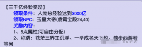 最后一个获得属性点的方式,当咱们的人物总经验达到3000亿的时候,可前往玉皇大帝处领取包括5点属性点在内的奖励。