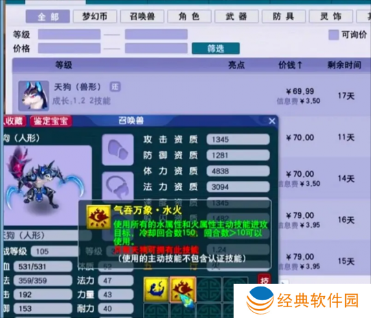 经过的差不多两周的时间,天狗的热度和价格都开始下降了。新资料片放出首周,天狗的价格在120~150元左右,目前小编所在的大区,天狗的最低价格只要70块钱了。不过也有玩家表示,天狗的真正价值就是在700w梦幻币左右。