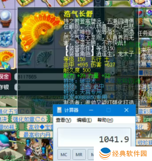 有小号鉴定出150初总伤868且力耐双加72的破甲坚固必中扇子,打上满锻玛瑙的综合总伤1041。这有属性还有PK小特技,单挑玩家用极其完美!