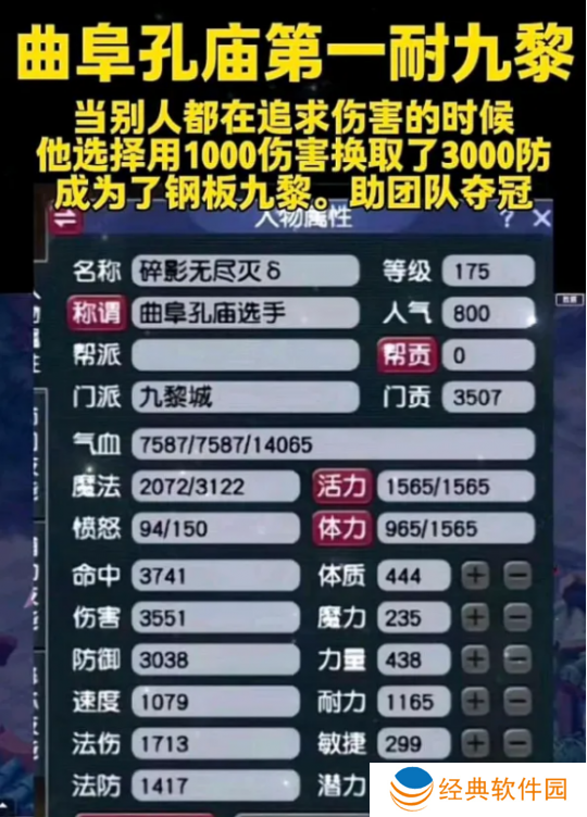 最近服战冠军是被曲阜孔庙团队拿到手里了,很多人都不知道的是,曲阜孔庙可以夺冠的关键因素就是钢板的九黎城,选择用1000点伤害换取了3000防御,现在的面板是14065的气血,命中+3741,伤害+3551,防御+3038,速度+1079,法防+1417,大家觉得这个属性如何?估计下一联服战比赛,肯定很多团队也会研究出新的套路来应对!