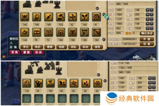 辅助技能方面,强壮45级,神速40级;炼药,烹饪,养生,健身这类赚钱技能也都点到了160级。