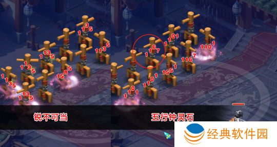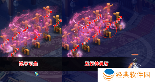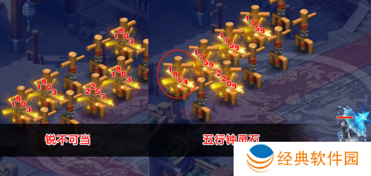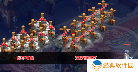 本场试验中,只有锐不可当和五行克制两套不同钟灵石对固伤输出产生影响。