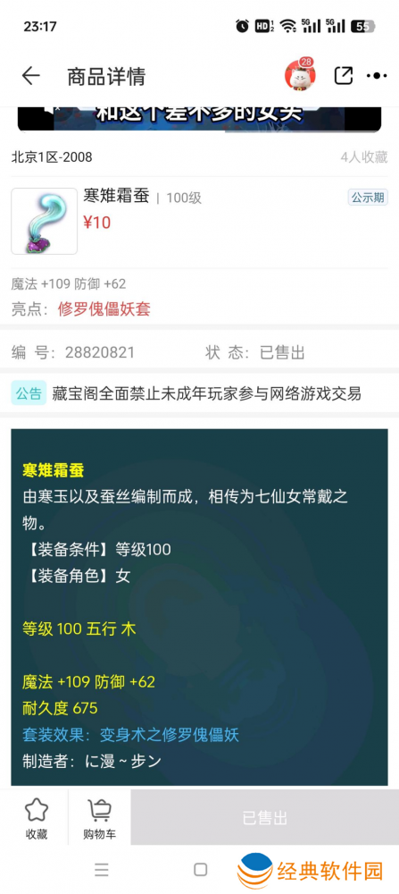在三界之中,“捡漏”并不限定在逛街摊位中,其实藏宝阁也暗含“玄机”。有位【2008】的玩家分享了近期的藏宝阁捡漏经历,他无意中发现一个100级傀儡妖女头摆价仅有10元,要知道这类敏捷套装深受固伤玩家的喜爱,正常市场价值约500元。